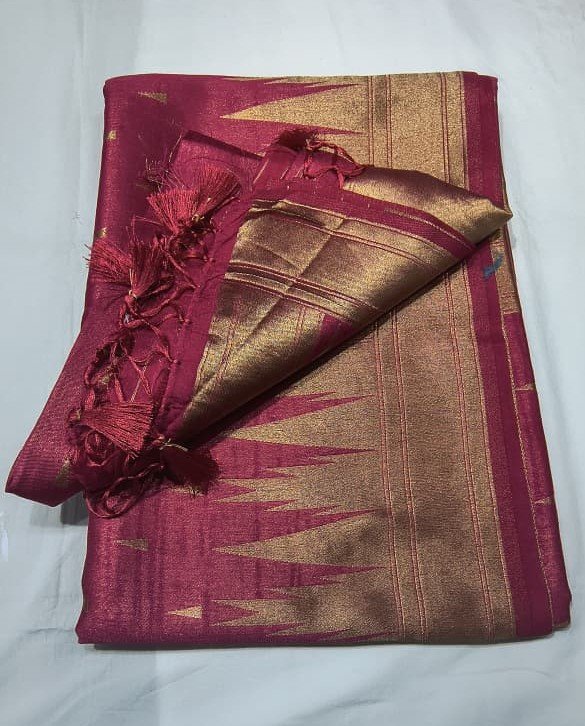 The saree is beautifully enhanced with a broad temple border that runs along the length, giving it a timeless and festive appeal. The zari-finished pallu with decorative tassels adds richness and makes the saree ideal for special occasions. The smooth texture and structured fall make it easy to drape and flattering for all body types.