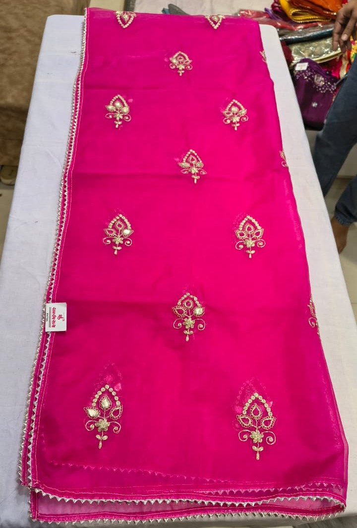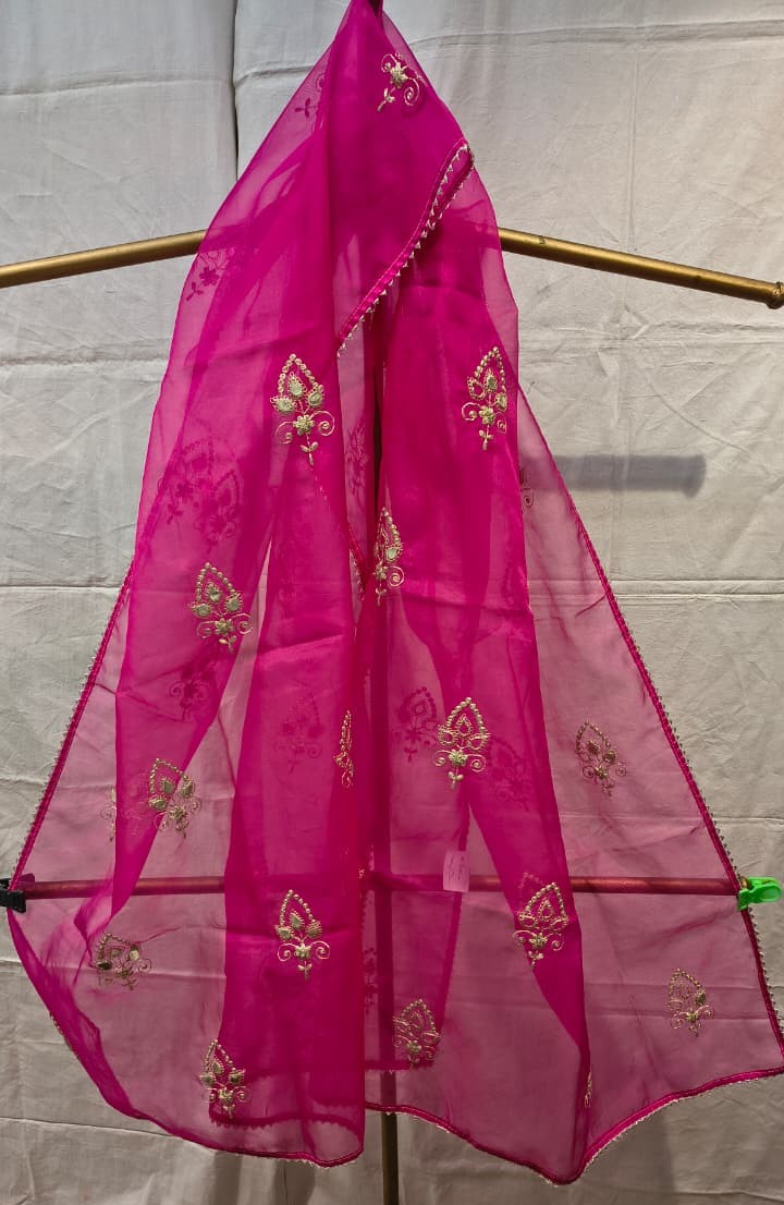 The lightweight and sheer texture of organza makes it perfect for draping with suits, kurtis, lehengas, and festive ensembles. The subtle shine of gota patti work enhances its traditional appeal while keeping the dupatta comfortable and easy to carry.
