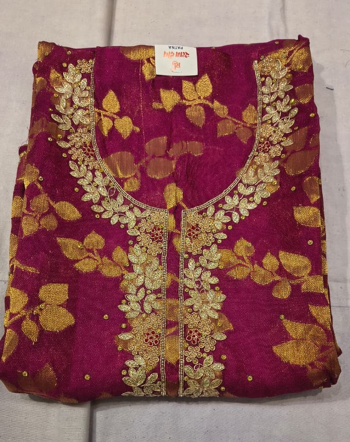 This Premium Organza Silk Suit Set is designed for women who love graceful elegance with a touch of luxury. The suit features a beautifully crafted organza silk kurta adorned with rich golden floral embroidery around the neckline and body, giving it a refined festive look.
