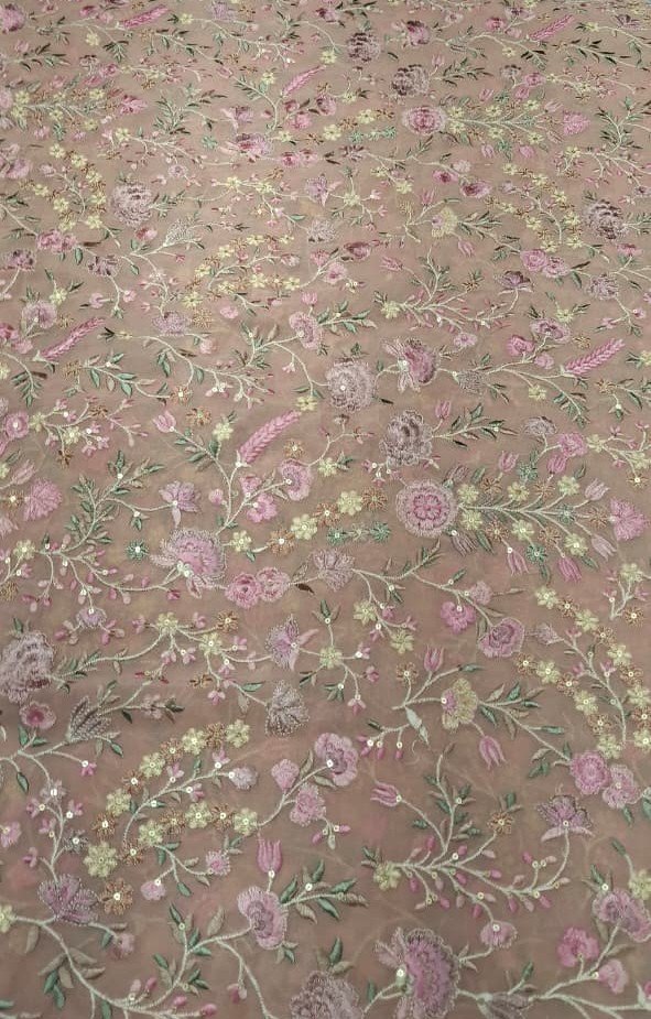 This Premium Peach Georgette Embroidery Work Fabric is a perfect choice for elegant and designer ethnic outfits. Crafted from soft and flowy georgette fabric, it features delicate multicolor floral thread embroidery spread beautifully across the entire fabric.