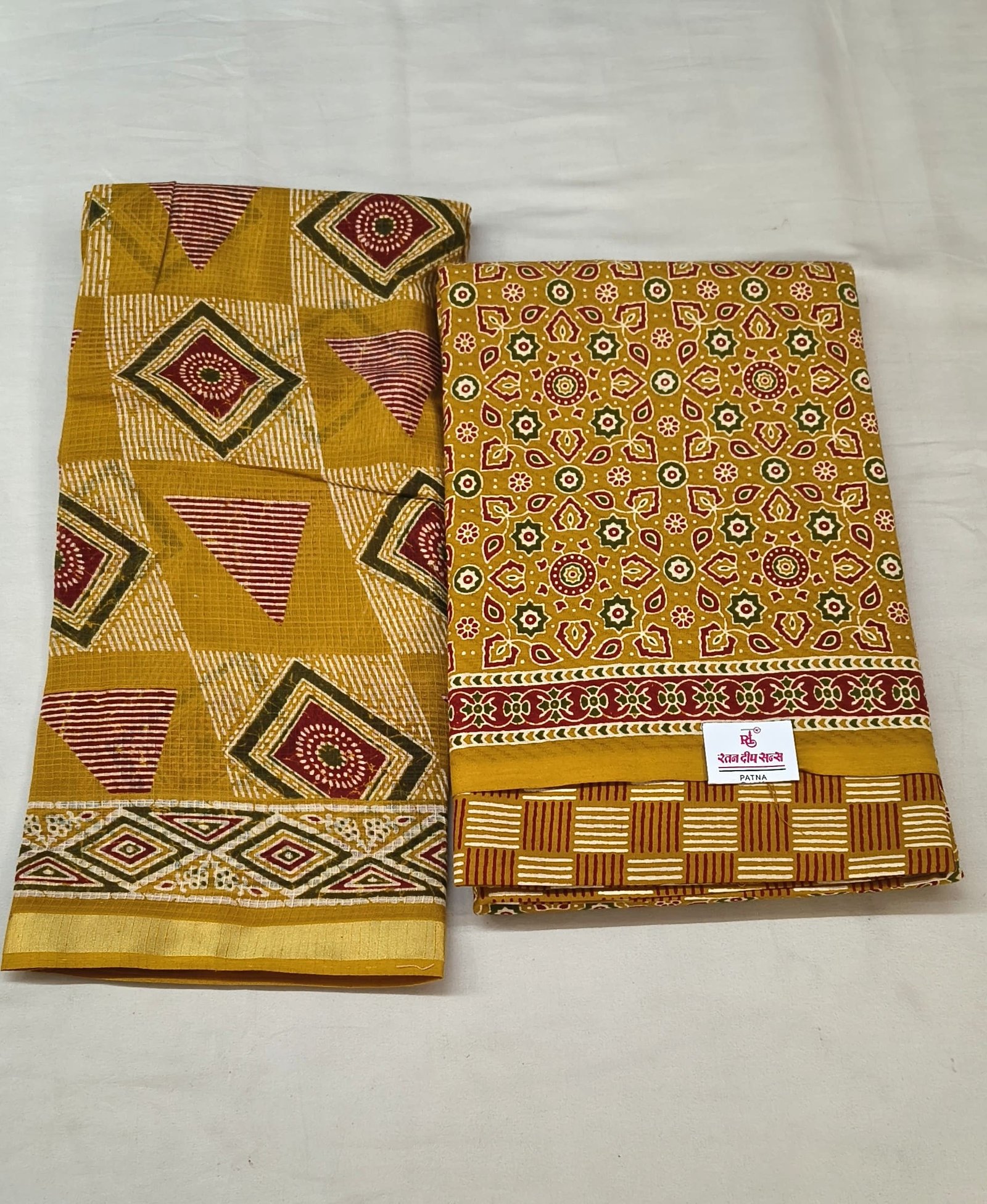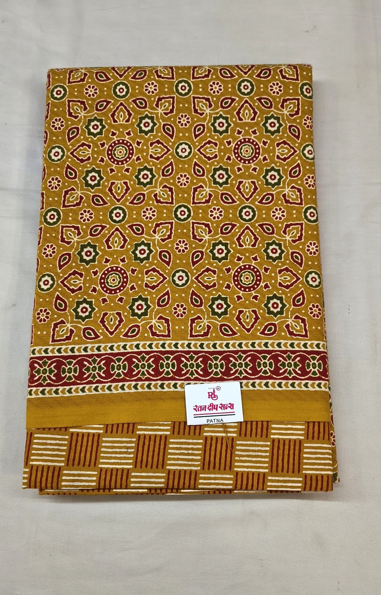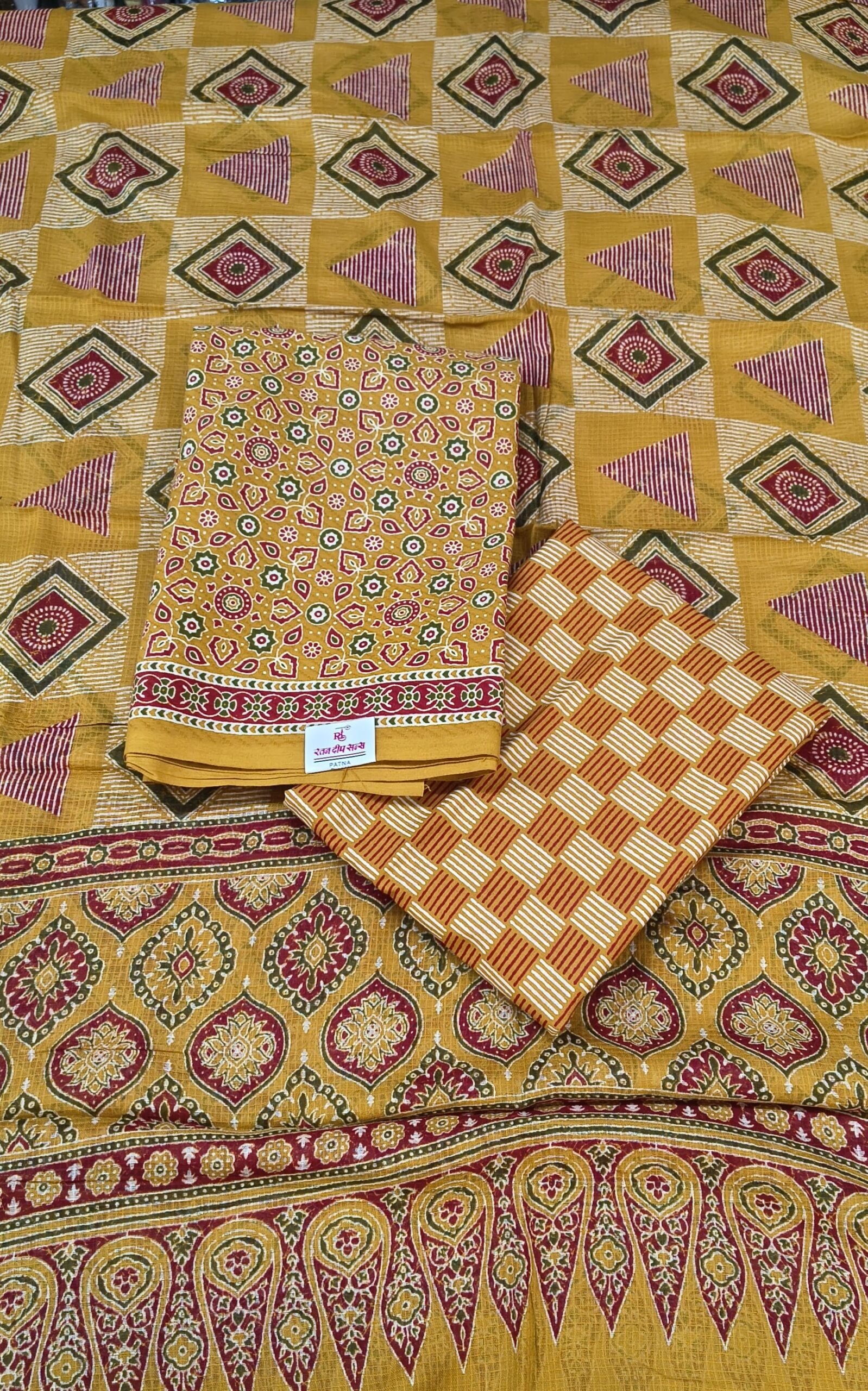 The suit features beautiful traditional block style prints with geometric and floral patterns, giving it a rich ethnic look. Made from pure cotton fabric, it is soft, breathable and ideal for all day comfort, especially in summer.