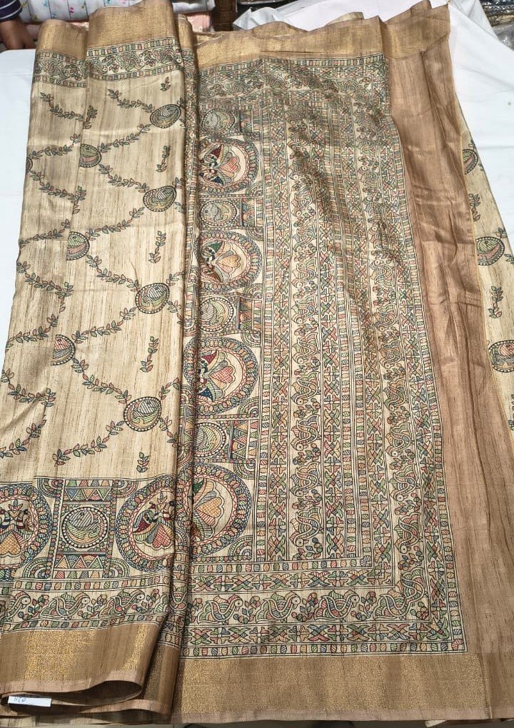 This Premium Tassar Cotton Madhubani Printed Saree is a beautiful celebration of India’s rich folk art and handloom heritage. Crafted from natural Tassar cotton fabric, the saree features intricate Madhubani art-inspired prints depicting traditional motifs, birds, and geometric patterns that reflect authentic Indian craftsmanship.
