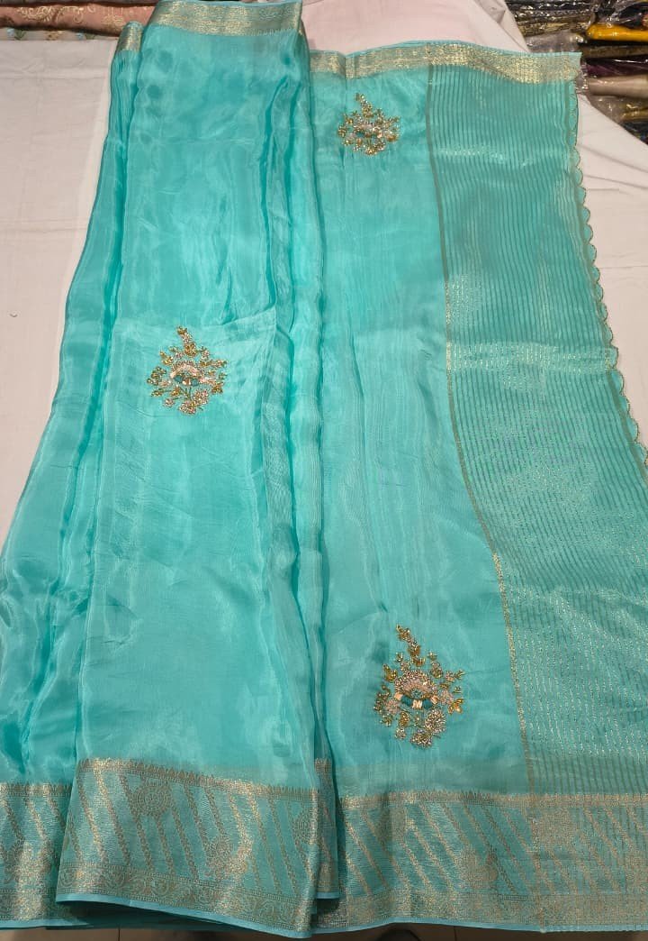 This Premium Tissue Silk Work Saree is designed to bring effortless elegance and refined charm to your ethnic wardrobe. Crafted from lightweight and lustrous tissue silk fabric, this saree features delicate embroidered and embellished motifs spread gracefully across the body, giving it a subtle yet luxurious appeal.