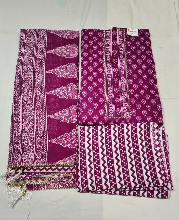 The set comes with a matching cotton dupatta adorned with coordinated prints and borders, along with a comfortable cotton bottom, making it a complete and ready-to-style outfit. The lightweight texture ensures all-day comfort, making it ideal for daily wear as well as casual occasions.