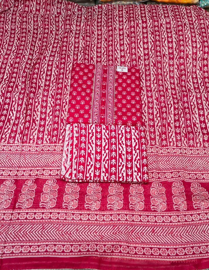 The set comes with a matching cotton dupatta adorned with coordinated prints and borders, along with a comfortable cotton bottom, making it a complete and ready-to-style outfit. The lightweight texture ensures all-day comfort, making it ideal for daily wear as well as casual occasions.