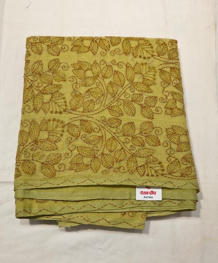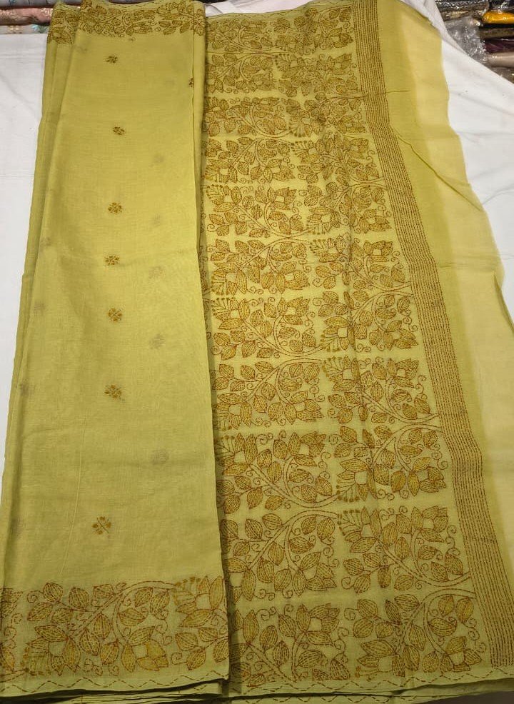 The saree is highlighted with a richly detailed contrast Kantha embroidered pallu and border, adding depth and visual appeal. The fine handwork patterns give the saree a distinctive handcrafted charm, making each piece unique. Lightweight in nature, this saree offers effortless draping and all-day comfort.