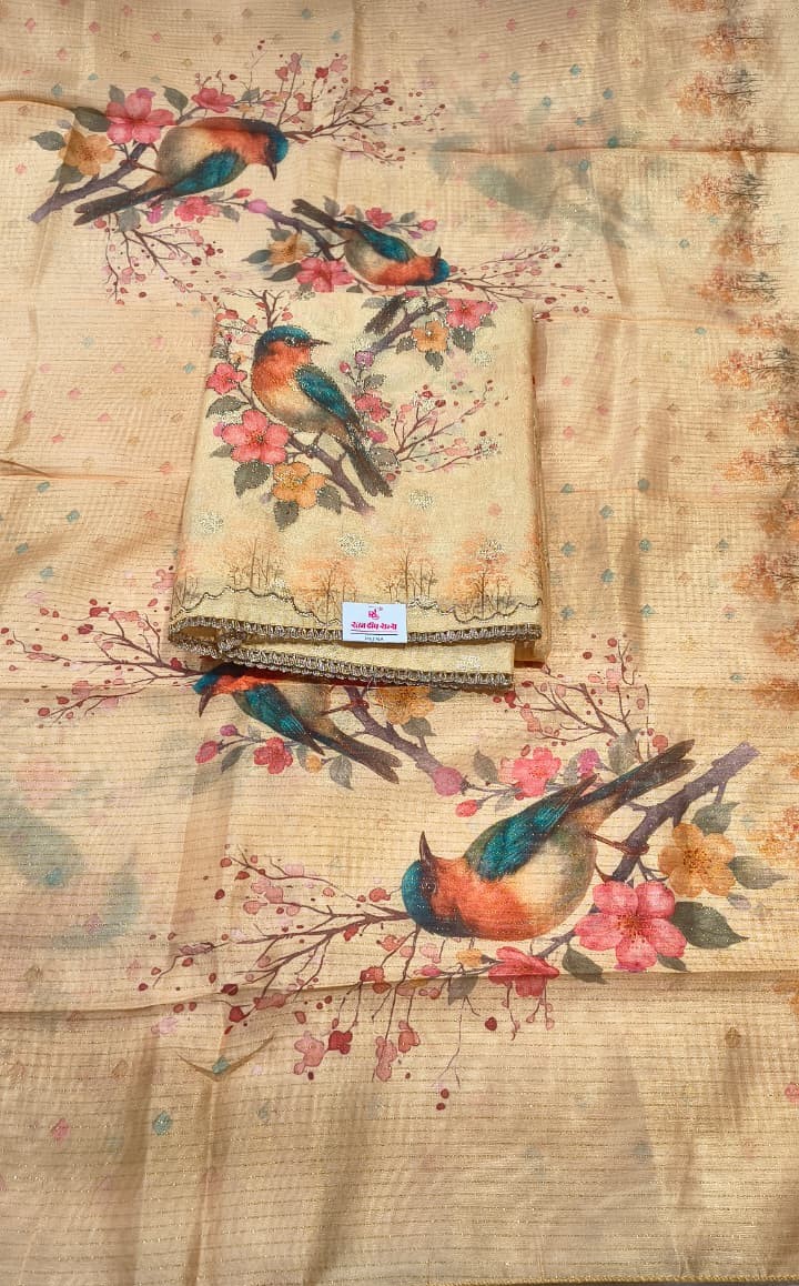 This Premium Tissue Cotton Unstitched Suit Set is a beautiful blend of artistic design and everyday elegance. The suit fabric is crafted from soft Tissue Cotton and features an eye-catching digital bird and floral print that gives a refreshing and graceful ethnic look. The subtle shimmer of tissue cotton adds richness while keeping the outfit lightweight and comfortable.
