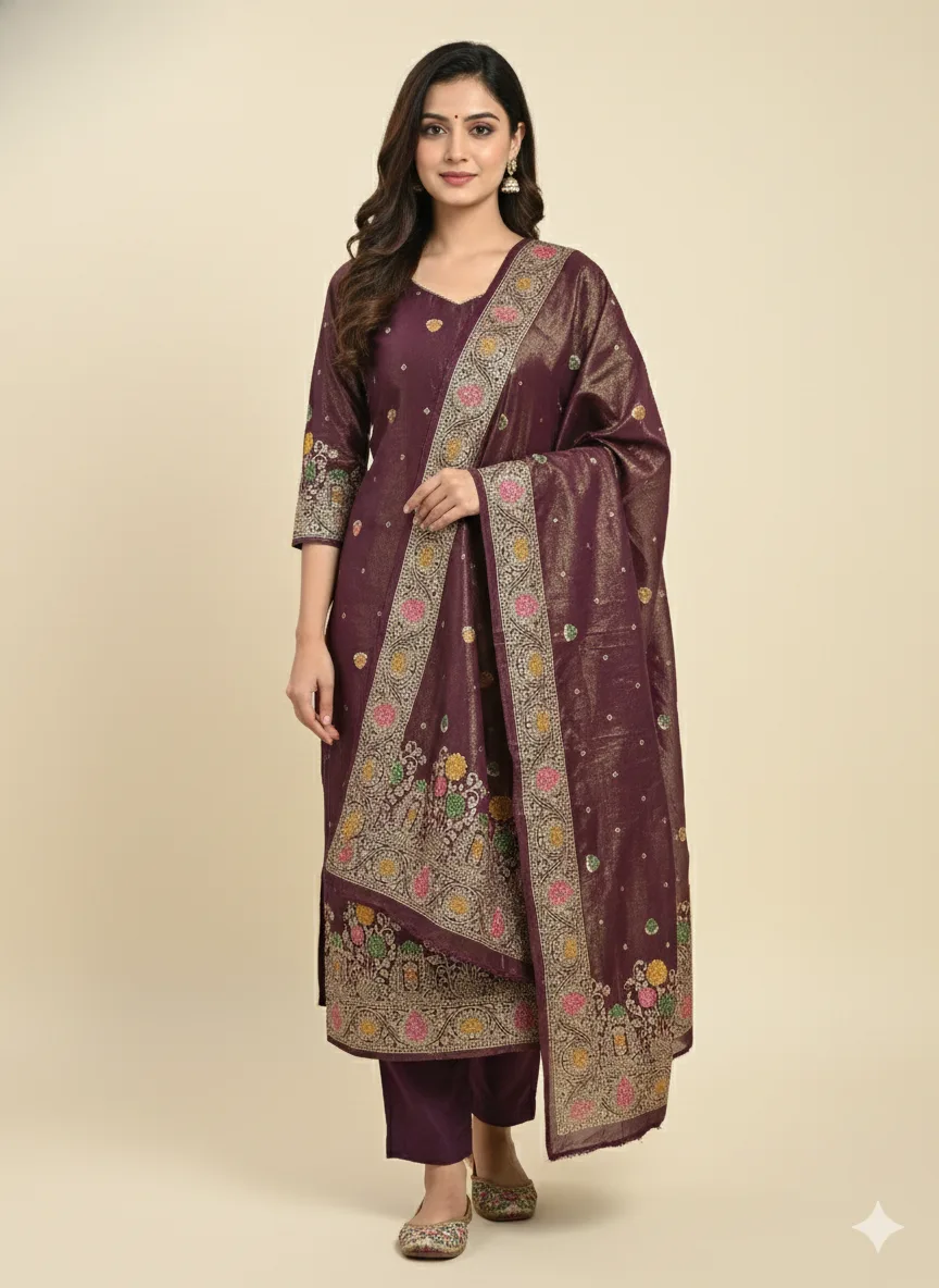 Add a royal touch to your ethnic wardrobe with this elegant Tissue Silk Unstitched Suit Fabric, crafted with beautiful Meena work. The kurta fabric features rich traditional motifs with fine detailing, giving it a luxurious and festive appeal. It comes with a matching solid bottom fabric and a graceful silk dupatta, making it perfect for special occasions.